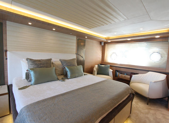 Main feature - Carbon Fiber opening T-Top for flybridge/ Custom Kenyon BBQ on fly/ 4 cabins plus crew quarter / Garage for 3.85 m tender and hydraulic up-down lifting platform (1,200 kg, 4.45 m)/ Tropical Air conditioning (including bathrooms and crew quarters)/ Extra tropical air conditioning (including crew quarters - generator upgrade recommended)/ 2 x 28 kVA generators/ Hydraulic bow thruster (30 hp) and anchor winch Hydraulic stern thruster (30 hp)/ Twin stainless steel 62 kg anchor at bow/ 2 Seakeepers stabilizers/ Humphree interceptors ATOS options/ 2 x additional 725 liter fuel tanks (= 1,450 extra fuel) , Electrical and Mechanical Equipment - Hydraulic stern thruster (30 hp)/ Hydraulic bow thruster (30 hp) and anchor winch Aft mooring winches/ Engine, Generator oil change system/ Racor filters for generator/ Engine driven emergency bilge pump/ Water maker 220 l/h / Megayacht underwater lights / Concelead lights for flybridge area/ Concelead lights for front cockpit area/ Rig for air bottles in engine room / Bauer Compressor (Oceanus - W 140I/min) and installation in engine room , Electronics and Navigation Equipment - Raymarine Smart Pilot SPX-SOL (main deck and flybridge dashboards)/ Boning LCD displays (3x19") on main deck dashboard (including Radar/GPS Chartplotter with Raymarine G-series processor and keyboard)/ Boning LCD displays (1x8,8") on flybridge deck dashboard/ Raymarine Radar Antenna (Open Array 72 nm - super HD 48")/ Upgrade Package 1: Radar Chartplotter GPS Raymarine GS 165 (2X15, 4" displays on flybridge dashboard)/ AIS receiver/ Raymarine Tridata / Chain counter (main deck and flybridge dashboards)/ Raymarine VHF DSC (main deck and flybridge dashboards)/ Raymarine Technocamera IR T470 stabilized / Engine digital displays/ Videocamera (aft cockpit and engine room)/ Searchlight/ 3G router for wireless WAN connection/ Engines spare kit (for 2 engines)/ Audio/ Visual integrated, based on Sonos system (for fly, bow and aft cockpit, main saloon and master cabin) with Fusion subwoofer/ Light system for crystal fashion plates , Interior Equipment - Miele (or equivalent) appliances (oven, galley extractor, hobs)/ Wine cellar - column (in lieu of dumbwaiter)/ Dish washer/ Wash & drier/ Miele Multifunction oven/ Dimmers for main deck, saloon and cockpit lights internal lights/ Courtesy lights stairs to access the cabins Safe box in owner's cabin/ Bidet in owner's bathroom/ Portholes mosquito nets/ Crockery, cutlery and glasses (set for 12)/ Wood floor on main deck saloon / Stone floor in bathrooms/ Towel sets for bathrooms (2 sets per bathroom)/ Tecma toilet/ Main dashboard seat in leather/ Main dashboard seat - electrical movement/ Mosaic tiles in owner head / Mosaic tiles in VIP head/ Mosaic tiles in guests head/ Convertible beds in guest cabin/ Headboard leather and top quality fabrics finishing/ VIP cabin vanity chair in leather and top quality fabrics finishing/ Satellite television system - KVH M7 (including wiring for decoder for main deck saloon and owner's cabin + dummy dome)/ BOSE Home Theatre system - Lifestyle V 25 - for owner's cabin/ 37" LED for owner's cabin (with Blue-Ray DVD players)/ BOSE Home Theatre system - Lifestyle V 25 - for main deck saloon/ 50" LED for main deck saloon (up/down lift system and Blue-Ray DVD player included)/ 32" LCD and blue ray DVD for VIP cabin/ Electrical blinds (owners and saloon) , Exterior Equipment - Up/down lifting platform: Hydraulic up/down lifting system - 1,200 kg max loading capacity; Platform size suitable for a 4.45m tender length/ Garage suitable for 3.85m tender length/ Concealed gangway/ Upgrade to port side main deck saloon bulkwark balcony with sliding saloon crystal door/ Upgrade to starboard side main deck saloon bulkwark balcony with sliding saloon crystal door (sliding crystal door in lieu of semi automatic watertight door to sideway)/ Flybridge hatch / Teak floor on cockpit/ Teak floor on sideways/ Cradle for tender on bathing platform/ Teak floor on bathing platform/ Teak floor on flybridge/ Sideways teak hand rails/ Additional cleats on sideways/ 5 Aft cockpit armchairs / Carbon Fiber T-Top on flybridge with soft sliding top/ Windows and windscreen external covers/ External cushions and sunpad covers / Front cockpit cover/ Aft flybridge cover/ Free standing shower for external use / Closing for Aft Cockpit on main deck/ Custom grill bar with Kenyon grill/ Forward lounge with sunpad / Hull and aft side deck painting/ Flag stem/ Aft access to engines room /crew quarters/ Dock side water inlet with water filters/ Fridge on flybridge/ Ice maker on flybridge/ 50" LED for fly bridge (up/down and rotation lift system and Blue-Ray DVD player included)/ Radio CD player on flybridge (remote control and speakers also on aft cockpit)/ Radio CD player for bow lounge area